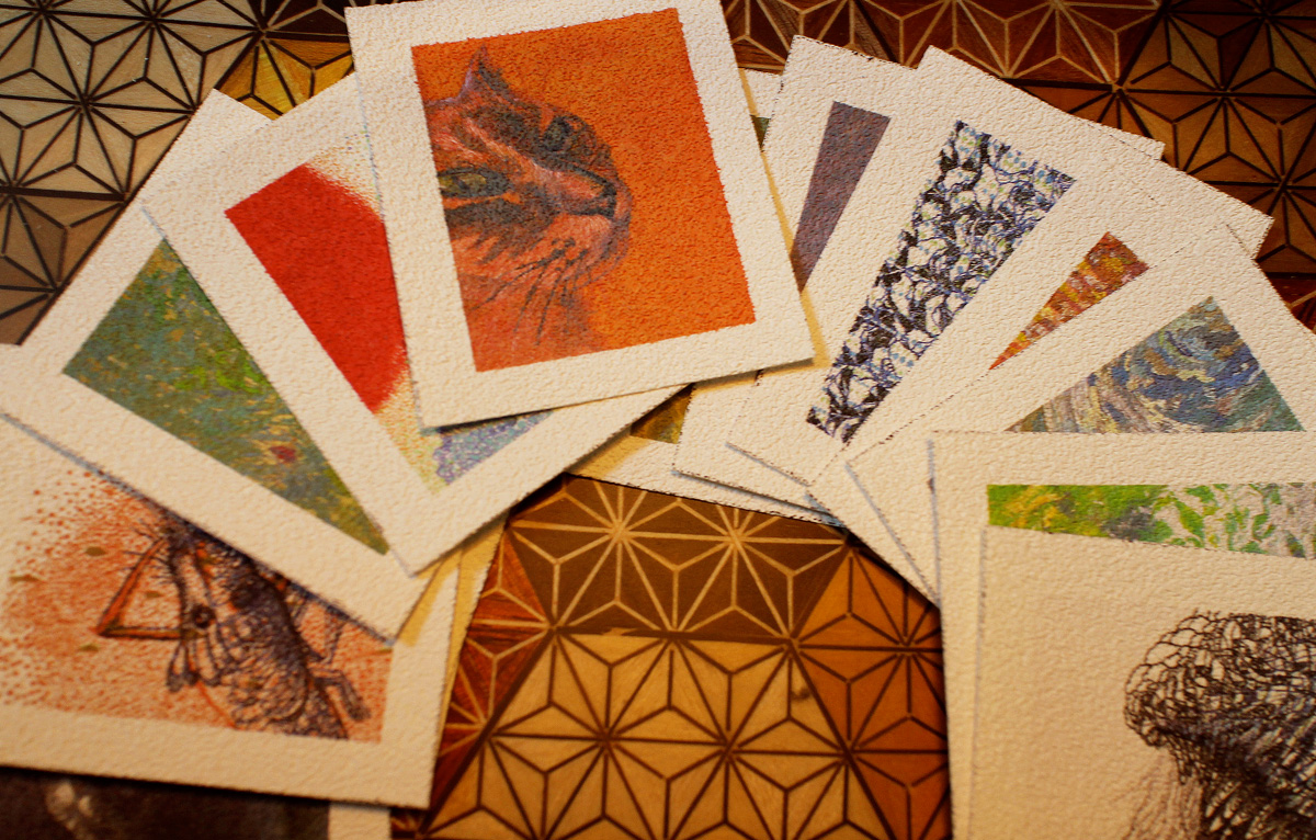 そして自作の絵をフォトショップで小さく加工→ザラザラした紙にプリントするのですが、この紙に印刷すると画像が少し暗い色になってしまうので、これまたフォトショップで加工→テスト印刷(納得がいったら印刷開始)