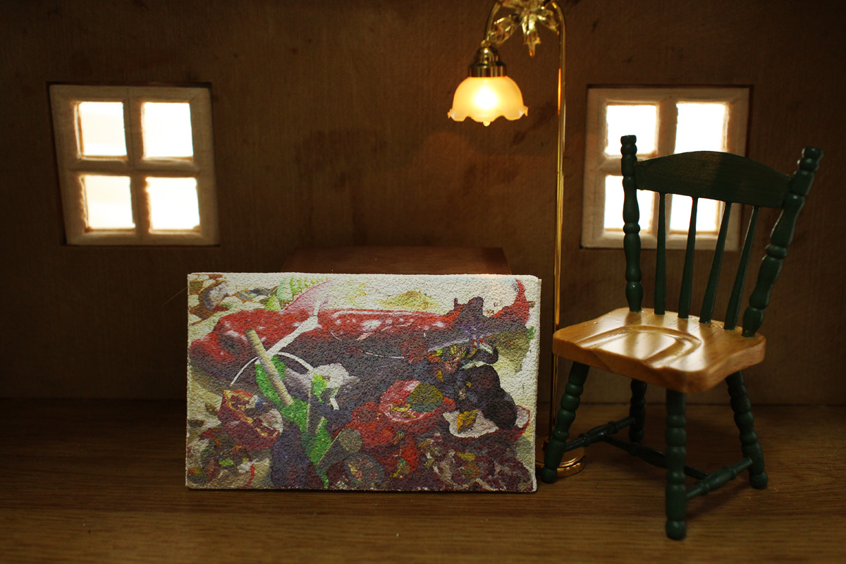 ミニチュアライトで遊んでいたらミニチュアキャンバスを置き始めて撮影してました…(ミニチュアキャンバスはドールハウスに飾れるくらいの大きさで作っております)