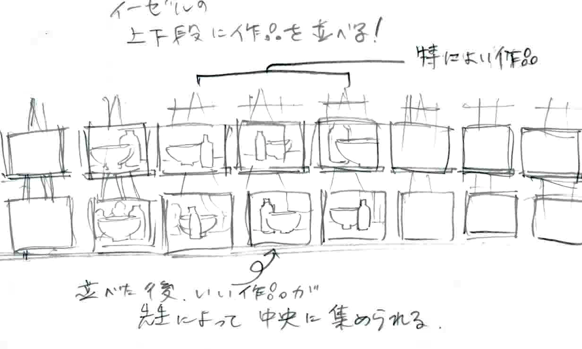 生徒が作品を並べた後、先生方が何人か来て作品を並べ替えます。